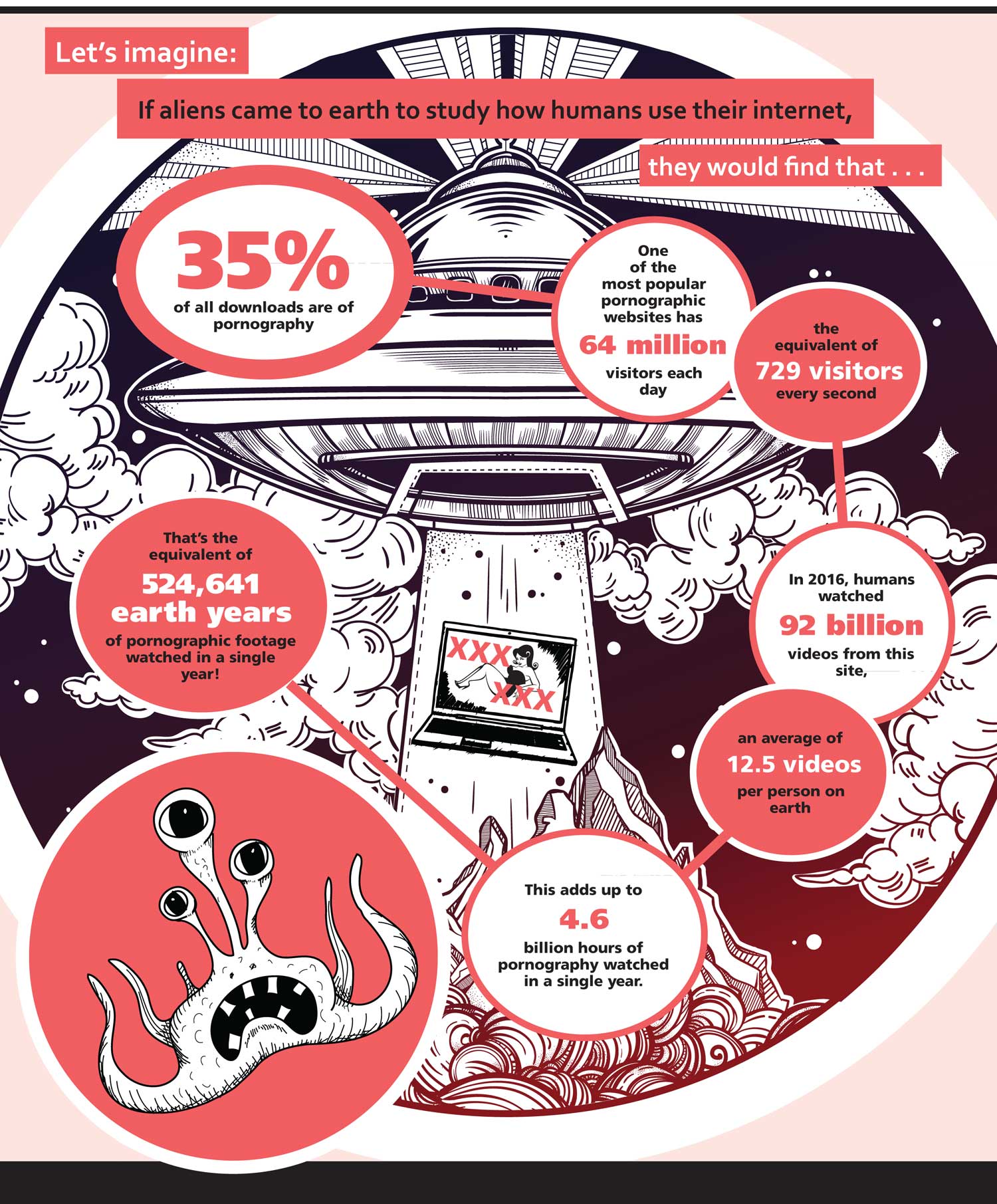 Let's imagine that an alien is visiting earth incognito to study human behavior before sending ambassadors to make the first formal contact with us. One of the first things he notices is that the Internet is an important part of human existence, being used for a wide variety of purposes, including obtaining news and information. But the alien also finds that 35 percent of all downloads are of something called pornography.1