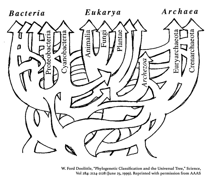 In 1999, W. Ford Doolittle reported that there was “evidence that most archaeal2 and bacterial genomes (and the inferred ancestral eukaryotic nuclear genome) contain genes from multiple sources” (see Figure 3).3 He characterized this phenomenon as “lateral gene transfer,” and he concludes that “no hierarchical universal classification can be taken as natural” and that “the history of life cannot properly be represented as a tree.”