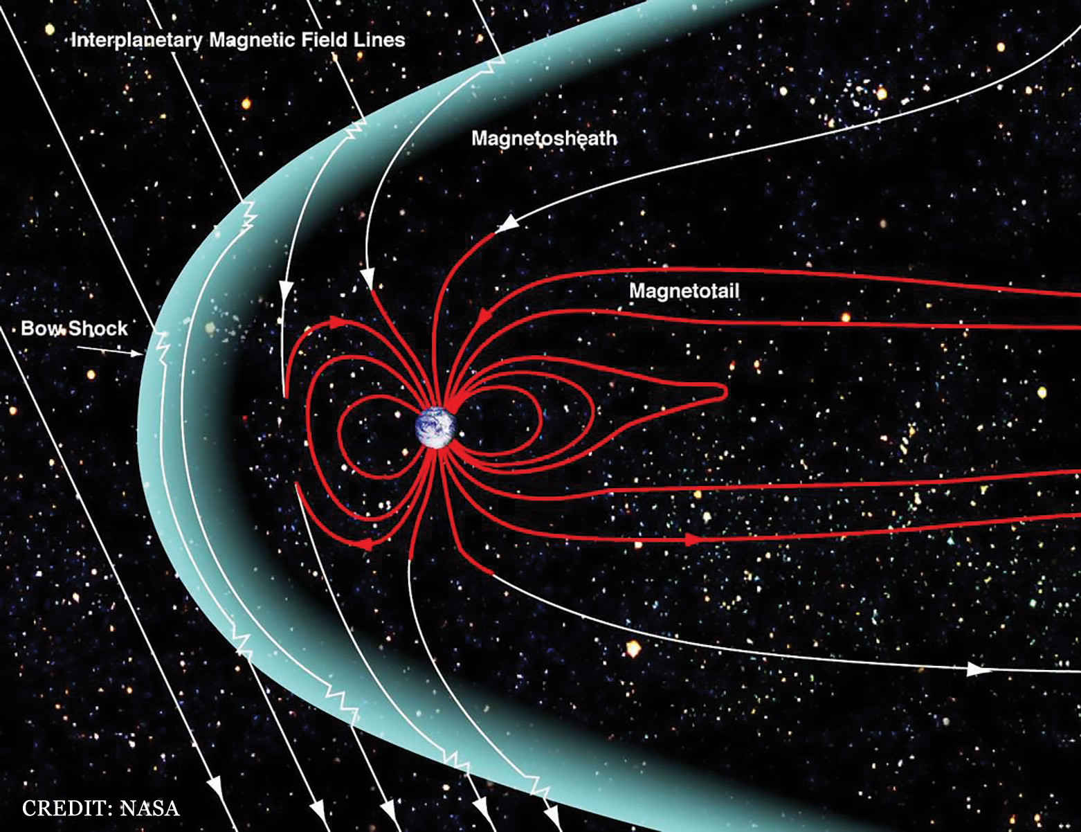 Earth’s magnetosphere (see figure) shields life on Earth from deadly cosmic radiation. Outside the magnetosphere, however, life is fully exposed. Serious exposure to heavy ion galactic cosmic radiation occurs in regions beyond the outer red lines emanating from Earth.